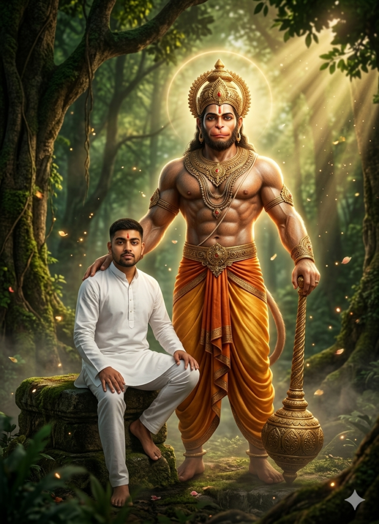 Ultra-realistic cinematic vertical portrait (864×1184) of Hanuman standing powerfully in a dense mystical forest, facing the camera with a calm, fearless divine expression, wearing a golden crown and flowing saffron dhoti, muscular form subtly glowing, holding a gada resting on the ground with one hand and placing the other protectively on a young Indian devotee’s shoulder; the devotee sits on a stone with one knee raised, wearing a white kurta pyjama, red tilak, and a serious devotional gaze toward the camera; background shows tall ancient trees, soft sun rays through leaves, light ground fog, glowing dust particles, and a subtle golden aura behind Hanuman; color theme of rich greens, golden sunlight, and earthy browns with volumetric light rays, shallow depth of field, cinematic HDR, ultra-detailed textures, epic devotional poster style, 8K quality, dramatic yet peaceful mood, using the devotee’s face from the uploaded image kept 100% identical.Prompt 4: Hanuman Meditation Aura