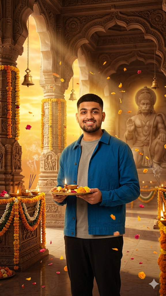 Ultra-detailed 4K Hanuman Jayanti devotional wallpaper of a person in a grand Indian temple with towering stone pillars and a glowing saffron sky, surrounded by marigold garlands, lit diyas, incense smoke, temple bells, and drifting flower petals; subtle Hanuman symbolism in the background with golden aura lighting, volumetric sun rays, cinematic depth, rich saffron and gold tones, ultra-realistic textures, and a premium wallpaper composition.Tips for Getting the Best Results from Your Hanuman Jayanti AI Photo Prompts
