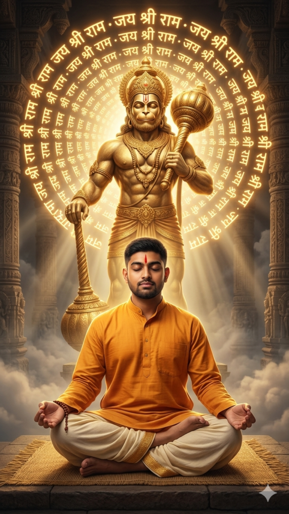 Ultra-detailed cinematic spiritual artwork of a young Indian man meditating in lotus pose, wearing a saffron kurta and off-white dhoti, eyes closed with a calm expression, hands in Gyan mudra, red tilak, softly lit by golden light; behind him stands a massive golden Hanuman statue holding a gada, muscular and radiant with a protective, benevolent expression, surrounded by a symmetrical spiraling halo of glowing “जय श्री राम” text forming a tunnel-like aura; background shows ancient temple pillars, carvings, mist, soft clouds, and descending god rays, with a gold and saffron color palette, volumetric lighting, soft fog, high contrast, ultra-sharp focus, cinematic 8K, and a divine epic mood.Prompt 5: Hanuman Jayanti Temple Aura