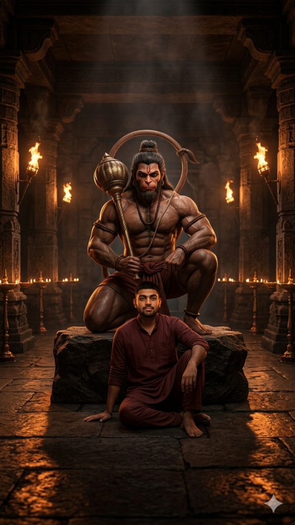 Ultra-detailed cinematic dark temple interior with Hanuman ji seated in a warrior pose on a stone platform, gada upright beside him, facing the camera with an intense, powerful expression, while a young devotee sits on the floor in front with one hand grounded and one knee raised, looking at the camera with confident devotion; the background features a dark stone hall lit by rows of oil lamps and pillar torches, with firelight reflections on the floor and a subtle smoky atmosphere, where dramatic shadows enhance muscles and facial features; color theme includes deep brown, dark red, and fiery orange highlights with strong contrast lighting, volumetric smoke beams, ultra-realistic textures, mythological epic poster style, 8K resolution, sharp focus, cinematic depth, using the face from the uploaded image and keeping it 100% identical.Prompt 3: Hanuman Divine Forest Protector